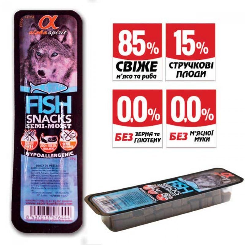Alpha Spirit Snacks Fish - гіпоалергенні беззернові напіввологі ласощі з рибою для собак у вигляді жувальних кубиків. Містять більш ніж удвічі більше вологи чому сухі продукти, що робить їх особливо смачними й добре засвоюваними. Може використовуватися як корисне доповнення до основного раціону вихованця, а також у якості частування або заохочення під час тренувань або виставок.