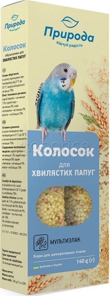 Повноцінний вітамінізований корм і ласощі для хвилястих папуг. Ласощі для хвилястих папуг по складу й харчової цінності наближене до раціону птахів у природних умовах. Добірні злаки й насіння повністю задовольняють потреба організму птахів у мінеральних речовинах, клітковині й протеїнах. Застосування: Зафіксуйте колосок у клітці, де сидять птаха. У поїлці постійно повинна бути свіжа вода.