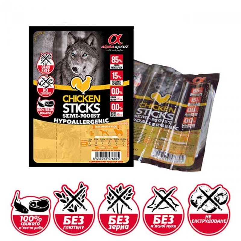 Alpha Spirit Sticks Chicken - гипоаллергенные беззерновые полувлажные лакомства с мясом курицы для собак в виде жевательных палочек.Описание