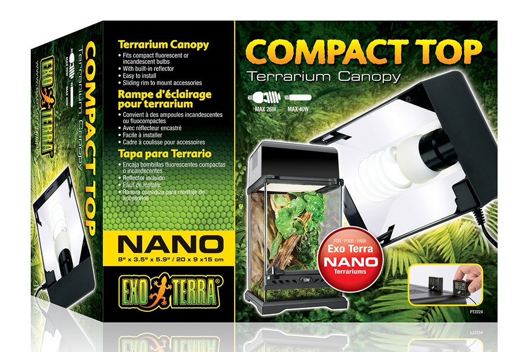 Exo-Terra Compact Top – серия светильников, разработанных специально для террариумов Exo-Terra. Линейка включает модели Nano, Mini, Small, Medium и Large. Каждая модель предназначена для террариума соответствующего размера и служит функциональным к нему дополнением.
