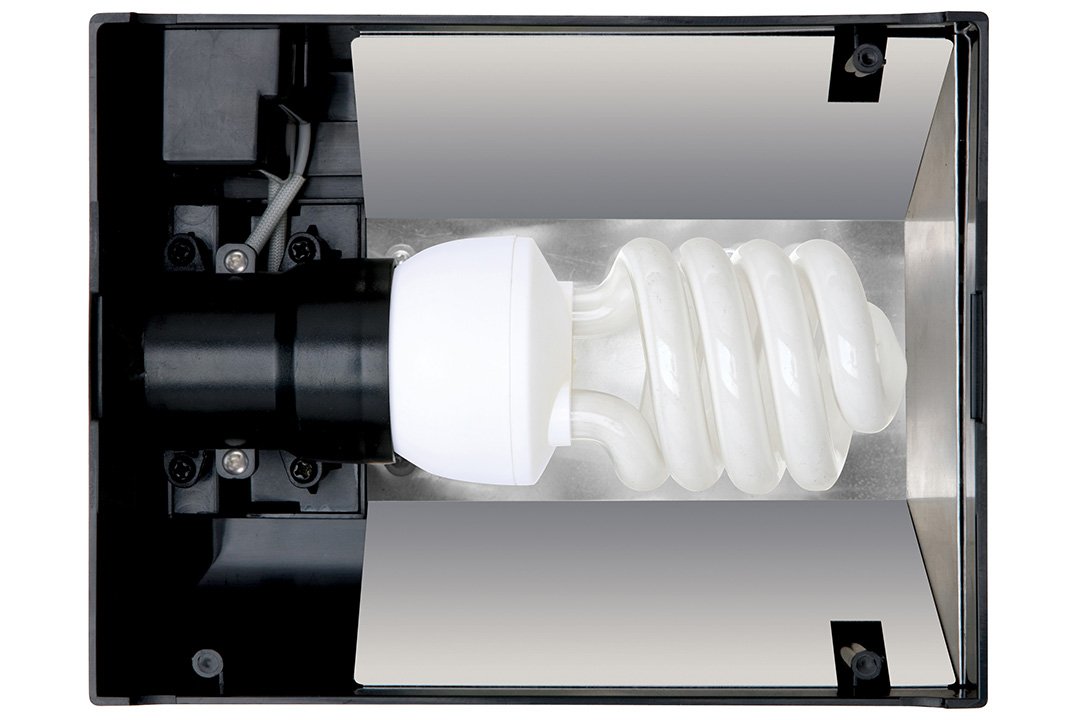 Светильник подходит для любых компактных осветительных и нагревательных ламп со стандартным цоколем E27 и мощностью до 26 Вт. Оснащен встроенным рефлектором, что позволяет направлять свет и тепло непосредственно в террариум. Верхняя панель светильника оборудована специальным пазиком для термометра, гигрометра или термогигрометра.