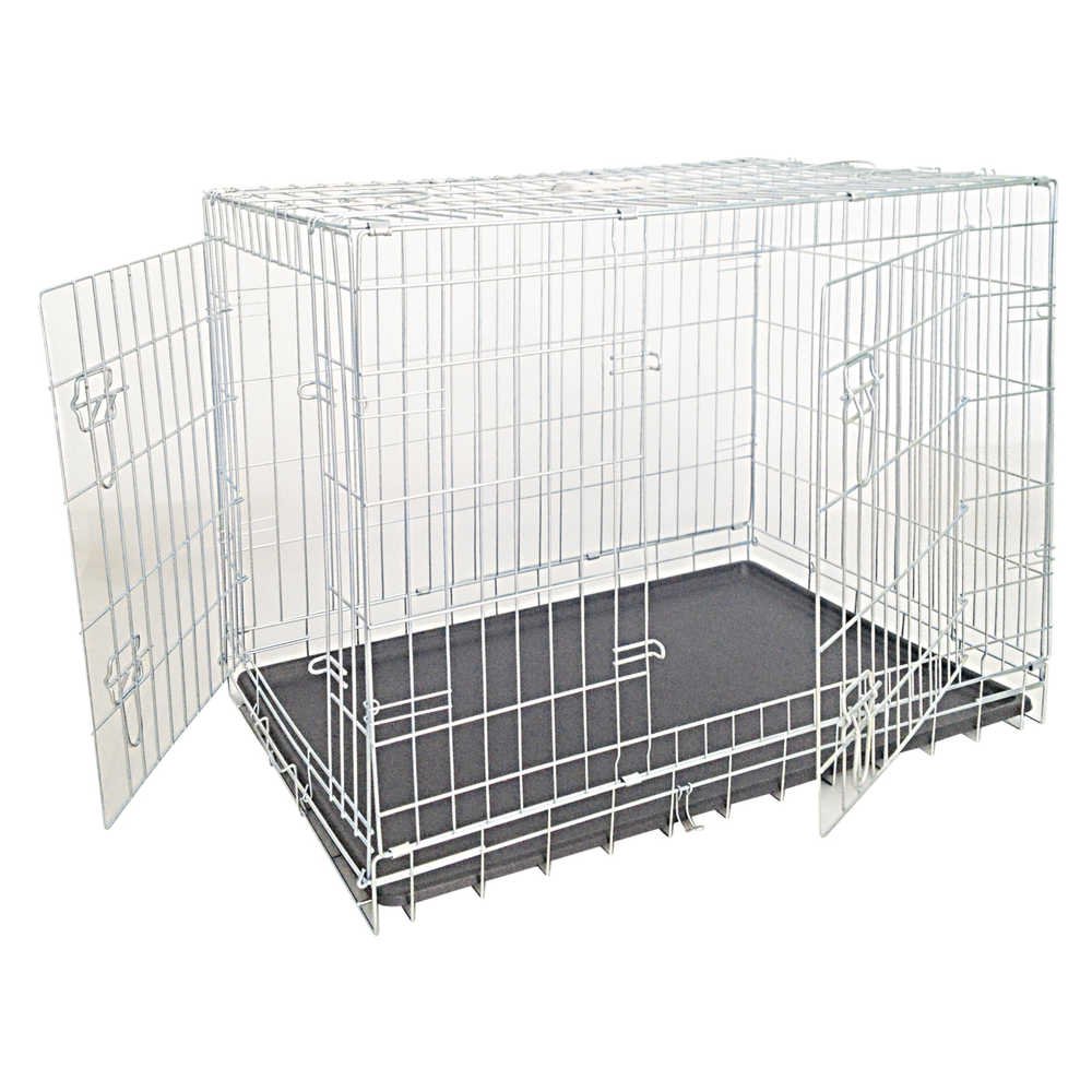 Клетка для собаки имеет две удобные дверцы, усиленные предохранительными замками с защелкой, а также пластиковую ванночку внизу, в которую можно положить удобную подушку.