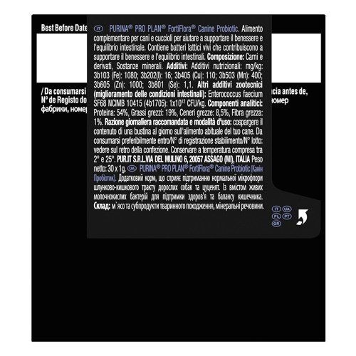 PURINA® PRO PLAN® FortiFlora® Canine Probiotic (ПУРИНА ПРОПЛАН ФортиФлора Канин Пробиотик) - это дополнительный корм, способствующий поддержанию микрофлоры желудочно-кишечного тракта взрослых собак и щенков. Содержит живые молочнокислые бактерии, помогающие поддерживать здоровье кишечника и баланс микрофлоры. Дополнительный корм не обеспечивает суточную потребность животных в питательных веществах и должен потребляться в комбинации с полнорационным и сбалансированным кормом.