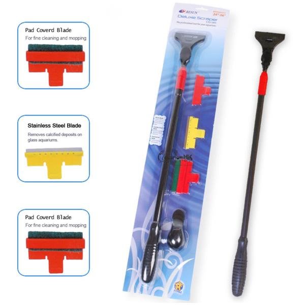 Профессиональный телескопический скребокRESUN DELUXE DS 36поможет справится с загрязнениями любой сложности. В комплекте идут три съемных насадки, которые помогут вам более эффективно справится с очисткой сильных загрязнений. Скребок не поцарапает и не испортит стекло аквариума.