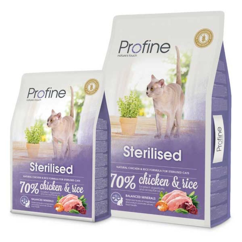 Специально разработанный корм для стерилизованных кошек и кастрированных котов. Такие животные нуждаются в дополнительных мерах по предотвращению образования камней в мочевыводящей системе, а также в контроле веса. Резкое изменение гормонального фона после операции, приводит к нехватке веществ, растворяющих и выводящих соли из организма. А снижение активности и нарушение баланса пищеварительных ферментов вызывает набор лишнего веса. Эти две проблемы и призван решить специальный корм Profine для стерилизованных кошек.
