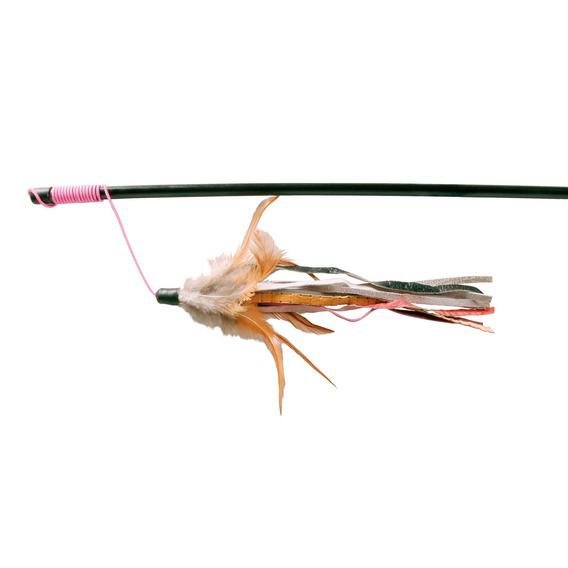 Аксессуар для игры с кошкой представляет собой удочку, на которой закреплены цветные перья.