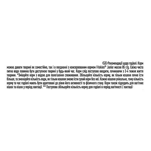 Корм можна давати тварині як самостійно, так і в поєднанні з консервованим кормом Friskies Junior масою 85 г/g. Свіжа чиста питна вода повинна бути доступною тварині у будь-який час. Корм слід поступово вводити, починаючи з 3 - 4 тижня життя тварини.