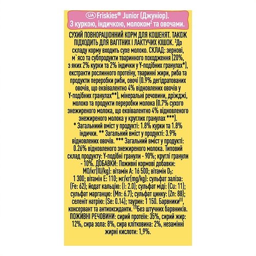 Friskies Junior (Джуніор) - це повнораціонний та збалансований корм, спеціально розроблений для підтримки здорового розвитку вашого кошеняти. Корм також підходить для вагітних кішок та кішок у період лактації. Friskies Junior (Джуніор) - це повнораціонний та збалансований корм, спеціально розроблений для підтримки здорового розвитку вашого кошеняти. Він забезпечує вашого маленького дослідника усіма необхідними речовинами для гармонійного переходу з материнського молока на тверду їжу, щоб дати вашому кошеняті чудовий старт у житті, сповненому відкриттів. Корм також підходить для вагітних кішок та кішок у період лактації.