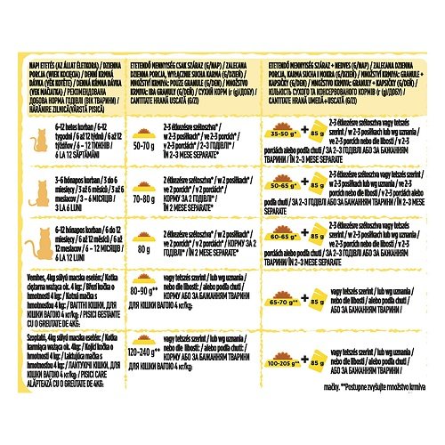 *Змішуйте корм з водою для полегшення споживання. Збільшуйте кількість корму, як тільки кошеня почне їсти більше, та зменшуйте кількість води, як тільки кошеня зможе їсти сухий корм без неї. Кожне кошеня унікальне, тому кількість корму та час годівлі мають бути адаптовані до рівня його активності на фізичного стану. Корм також підходить для вагітних кішок та кішок у період лактації.