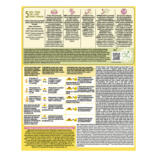 Склад: зернові, м`ясо та субпродукти тваринного походження (20%, з яких 2% курки та 2% індички у Y-подібних гранулах*), екстракти рослинного протеїну, рослинні олії та тваринні жири, риба та продукти переробки риби, овочі (0.9% дегідратованих овочів, що еквівалентно 4% відновлених овочів у Y-подібних гранулах**), мінеральні речовини, дріжджі, молоко та продукти переробки молока (0.7% сухого знежиреного молока, що еквівалентно 4% відновленого знежиреного молока у круглих гранулах ***).